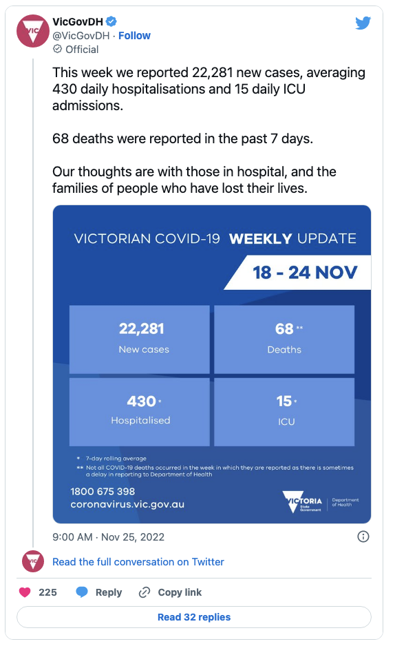 维州记录了 22,281 例新感染病例,高于上一个报告期的 20,398 例。有 68 人死亡,增加了 22 人。连续 7 天的平均住院人数从 352 人增加到 430 人,ICU 入院人数也增加了七人。