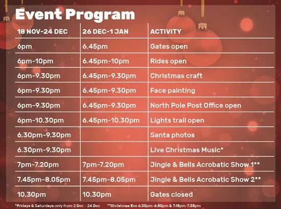 时间:具体日期请关注1st December to 1st January 8:30PM To 1:00AM