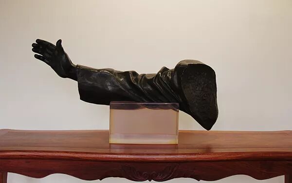 展览将其中一个展厅改造为传统文人书房,室内的书架上陈列着隋建国所收藏的古生物化石、石器时代的器具、东西方艺术著作,以及小尺幅的《衣钵》《盲人肖像》和部分作品泥稿——艺术家在人类文明从自然界萌生发展、中西方社会历史对照的宏大历史坐标中寻找自我与世界的关联。