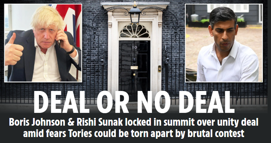 同时,约翰逊还与苏纳克于22日当晚进行了秘密会面,试图达成关于“谁来担任首相”的协议——如果协议达成,他们中的一人将担任首相,另一人将将获得内阁高级职位。