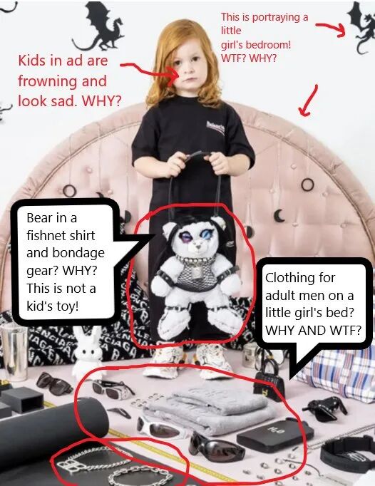 人们谴责巴黎世家的广告元素“恶心”,含有色情暗示的物品和儿童不应该出现在同一画面中且被公然宣传。