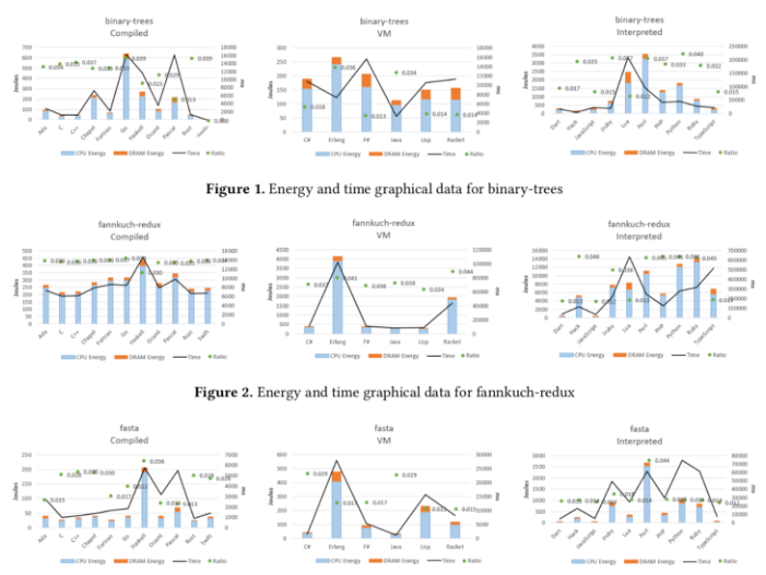 然而,性能测试并没有考虑到编程范式,重要的是编程语言的类型:编译型、解释型,还是使用了虚拟机?编译语言、虚拟机语言和解释语言之间存在明显的性能以及能耗差异。因此,他们针对各个类别,采用这些算法进行测试,这种做法是正确的。