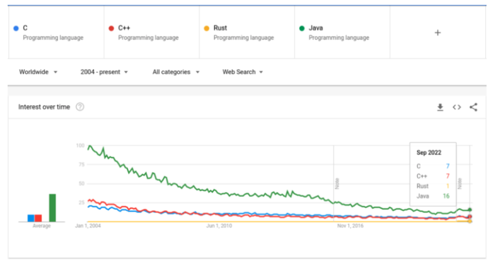 Google 的趋势分析工具是向所有人开放的。我曾使用这个工具来获取有关编程语言的 Google 搜索统计信息,但其中存在一个限制:只能获取 5 个搜索关键字的数据。因此,首先我们来看看排名前三的语言(C、C++ 和 Rust)以及 Java 的结果。