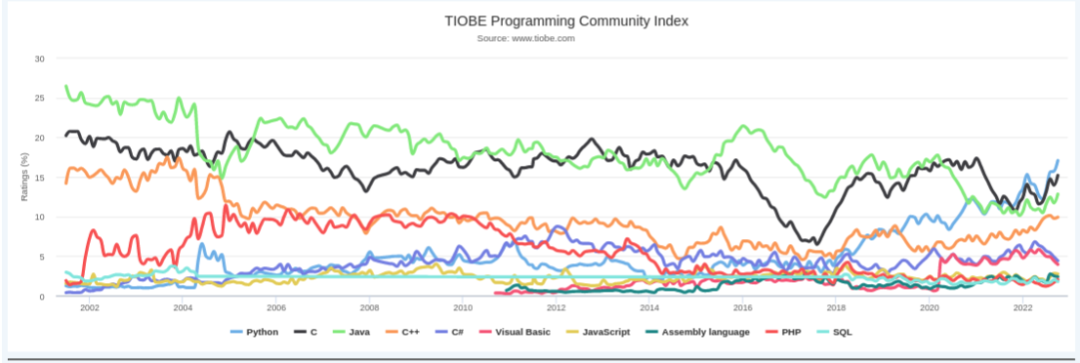 这与Google流行趋势给出的结果非常接近。然而,根据这个指数,C是排名第二的编程语言,这有点出乎意料。此外,TIOBE还有一个编程语言性能的历史表,如下所示: