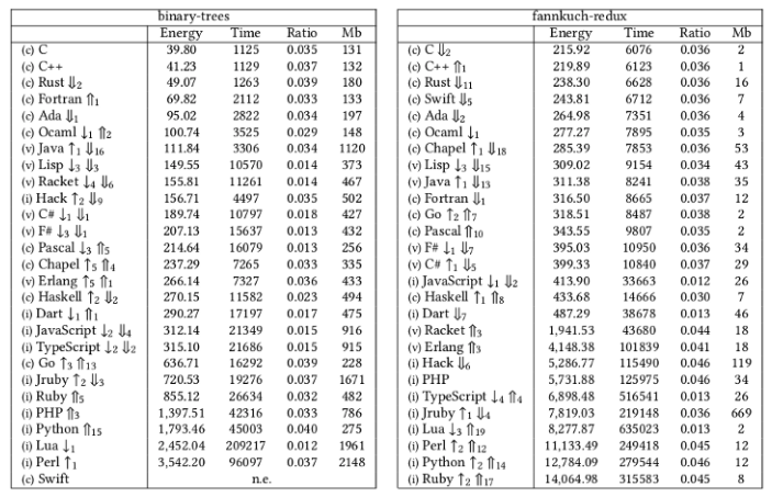 能耗的测量以焦耳为单位,时间以秒为单位。而比率是能耗与时间的比值,得出的是计算语言的能耗近似值。另外,各个语言名称旁边还有上下箭头。箭头代表在根据执行时间对这个表进行排序的过程中,该编程语言上升或下降了多个位。双线箭头是同样的意思,但顺序是根据内存使用情况的峰值决定的。
