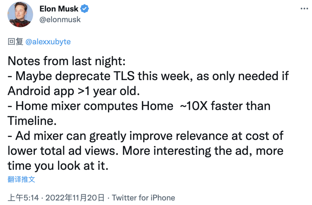 在 2012 年架构图中,我们也惊奇的发现,彼时的马斯克作为热点人物,频登 Twitter 推荐专区。而最初的「初闻不知曲中意」,已然成为如今的「再听已是曲中人」。对此,马斯克也在这条推文下方留言分享了自己在会议上所做的笔记: