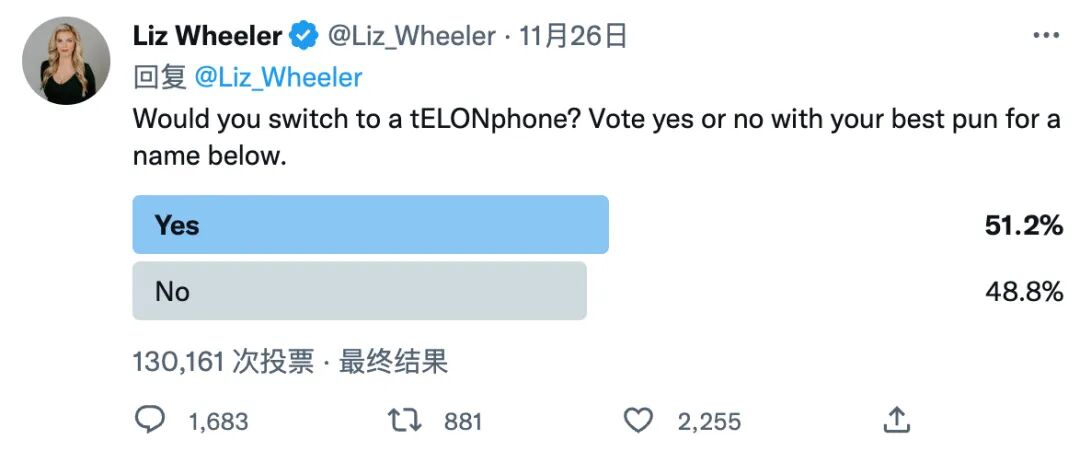 为此,Liz Wheeler 针对这一话题还发起了一场投票,询问用户是否会使用“tELONphone”牌手机。最终,在 13 万人的投票中,有 51.2% 的用户投了“Yes”选项。