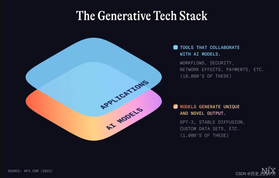 “生成式 AI”(Generative AI)或 “AIGC”(AI-Generated Content)这样的名字已经广为人知,但事实上,AI 只能构成这项技术的等式的一半。AI 模型仅仅只是这些堆栈的使能基本层,而它的顶层将是数千个甚至数万个应用程序,是整个成熟的生态。本文将用一个更宏观的概念—— “生成式技术”(Generative Tech),来命名这场变革。