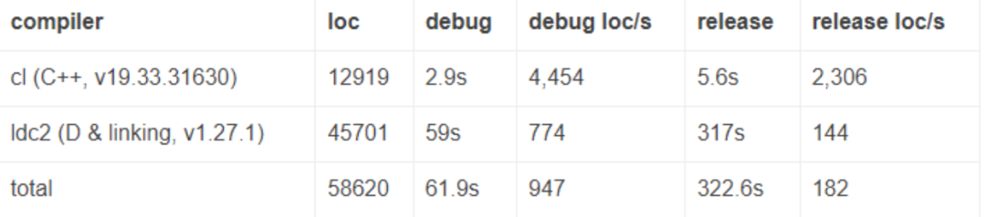 整个代码库有 45,701 行 D 代码和 12,919 行 C++ 代码,总共 58,620 行。 编译时间如下: