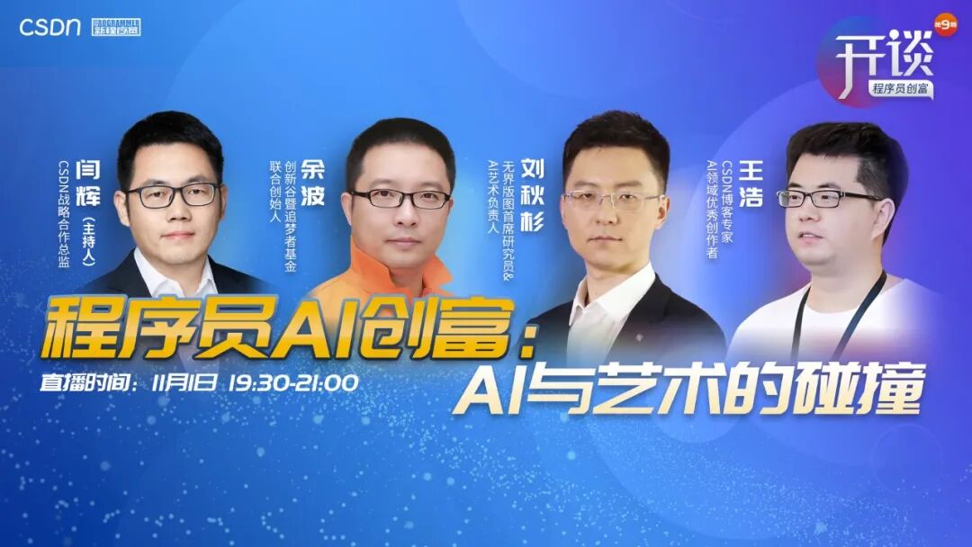 在本期《开谈:程序员创富系列》访谈中,我们邀请到了创新谷暨追梦者基金联合创始人余波,无界版图首席研究员& AI 艺术负责人刘秋杉,CSDN 博客专家、AI 领域优质作者王浩 ,在 CSDN 战略合作总监闫辉的主持下,围绕 AIGC 的技术和商业模式的变化进行了讨论。本文也将从 AIGC 的创业者和 AI 技术专家的视角出发,对程序员 AI 创富的相关话题进行讨论。