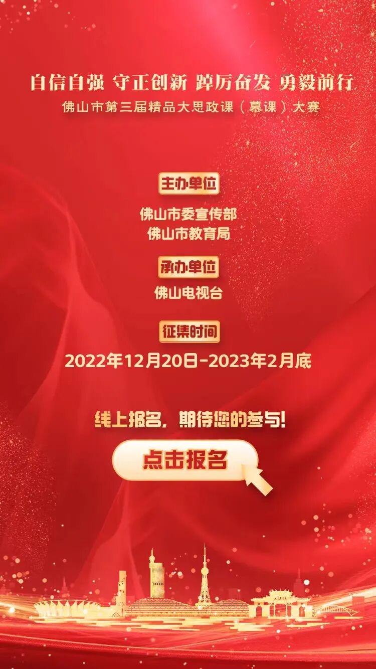参赛作品要求突出核心内容,结合时代特点,围绕党的二十大精神,反映新时代佛山教职工和青少年学生风貌;参赛作品须为原创作品,鼓励采用多样化的教学方法和艺术表达形式,综合运用小组研学、情景展示、课题研讨、课堂辩论等方式组织课堂实践,增强思政课针对性、互动性和有效性。