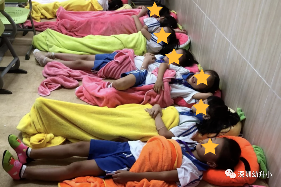 孩子们只要拿出铺盖,在教室边上并排躺下,拉上遮光窗帘后,便是一个简约的午休环境。每天的午休时间,正副班主任以及家长义工们都会在教室进行监管。