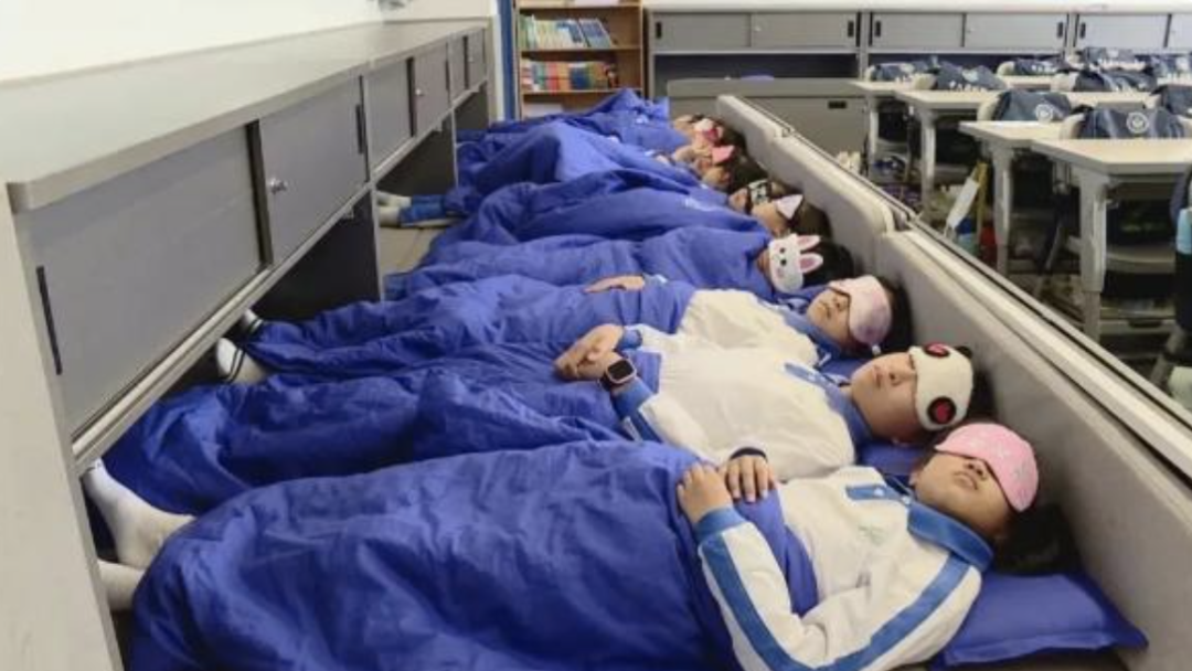 学校在每间教室都配备了折叠式午休床,教室里除了讲台以外,其它三面墙壁都有储物柜,把这些储物柜一一拉开,就变成了午休床。在储物柜里,学校还很贴心地准备了眼罩、枕头和小被子。