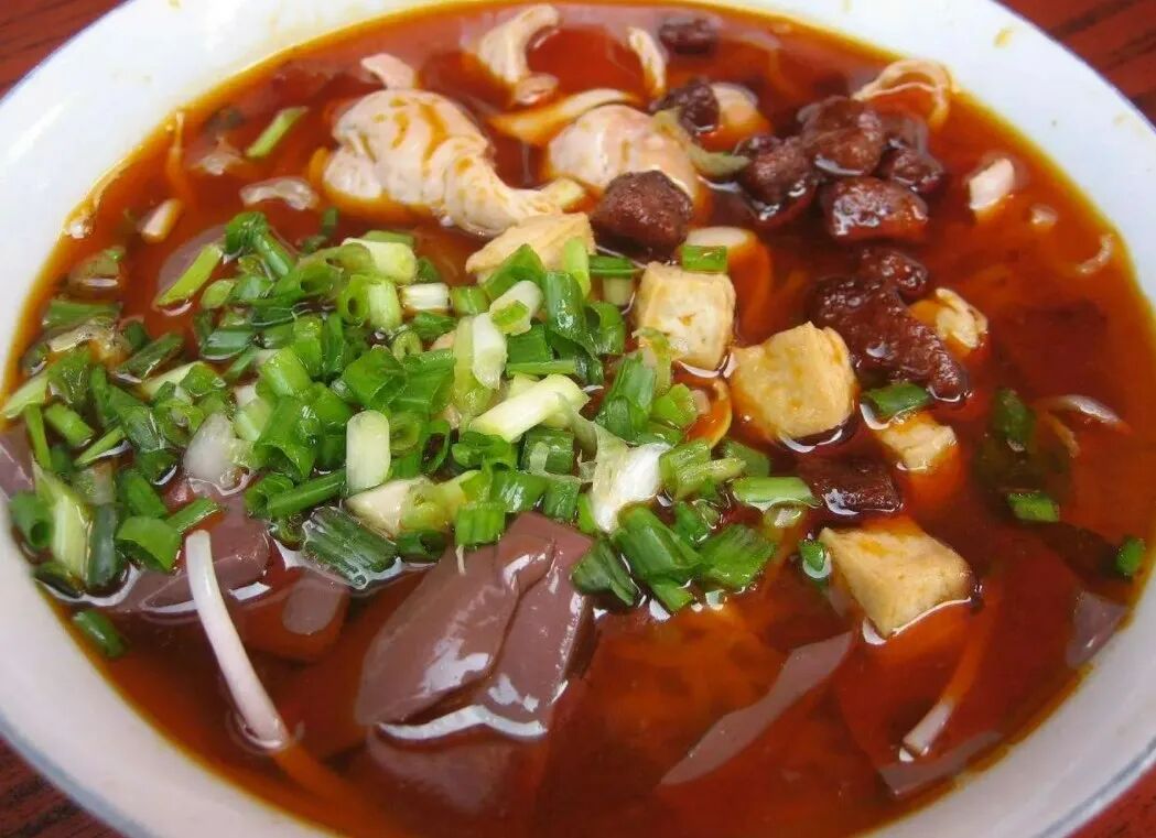 西南三省各有地方小吃,成都的“龙抄手”“赖汤圆”、昆明的 “过桥米线”,我都去领教过,确实别有风味。贵阳家喻户晓的小吃也有好几种。首先让我来介绍我们的肠旺面,听说出名最早的要数解放前南京街(今中华北路)的苏肠旺。他家的面条,是加鸡蛋的白面粉擀的,肉汤味派,面条上的浇头,有脆小粉肠、肥大肠(又名马蹄),加上旺子(猪血),再倒上一点红油,并不太辣,非常可口。现在肠旺面在贵阳街市上已成为人们普遍的早点了。这类面馆都比较小,容纳不了很多人,营业员便把一张又一张的小方桌摆到门外甚至人行道上。食欲很强的客人,一碗不够,再来一碗。熟悉本地小吃的同志告诉我,近年来还能继承“苏肠旺"优良烹调传统的只有一家“陈肠旺”,其他的馆子都一般化了。