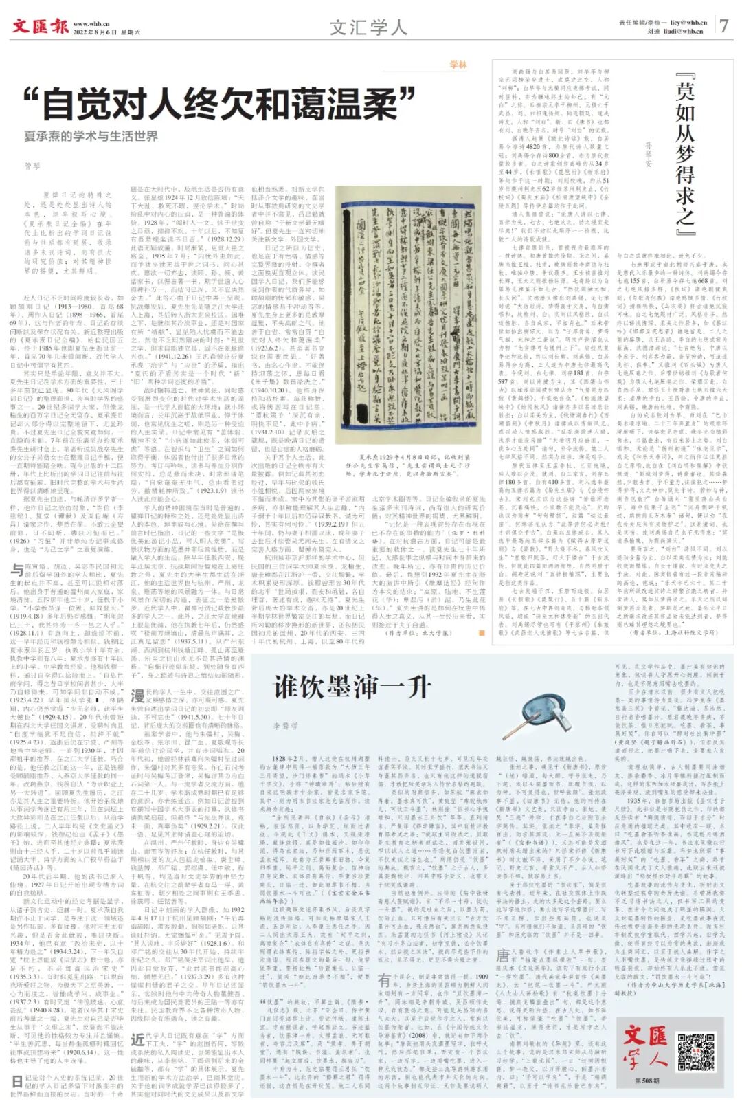 杭州虽非京沪那样的学术中心,但民国的三位词学大师夏承焘、龙榆生、唐圭璋都在江浙沪一带,交往频繁,学术积累更形深厚。钱穆曾形容30年代的北平“世局虽艰,而安和黾勉,各自埋首,著述有成,趣味无倦”。夏先生背后庞大的学术交游,亦是20世纪上半期学林世界繁密交往的写照。而日记所勾勒的移步换形的新世界,还包括民国初元的温州,20年代的西安,三四十年代的杭州、上海,以至80年代的北京学术圈等等。日记全编收录的夏先生诸多未刊诗词,尚有很大的研究价值;而绵密的记载中对其精神世界的揭橥,尤其鲜明。马赓良谓复堂日记“毗卢遮那足下一光,下照阿鼻,非师子频申,三昧全力也。然其渟著之渊深,取材之宏富,浑浑灏灏,莫测涯涘”。虽为断篇,传之亦可不朽,也是因其建立的精神世界之博大渊深。