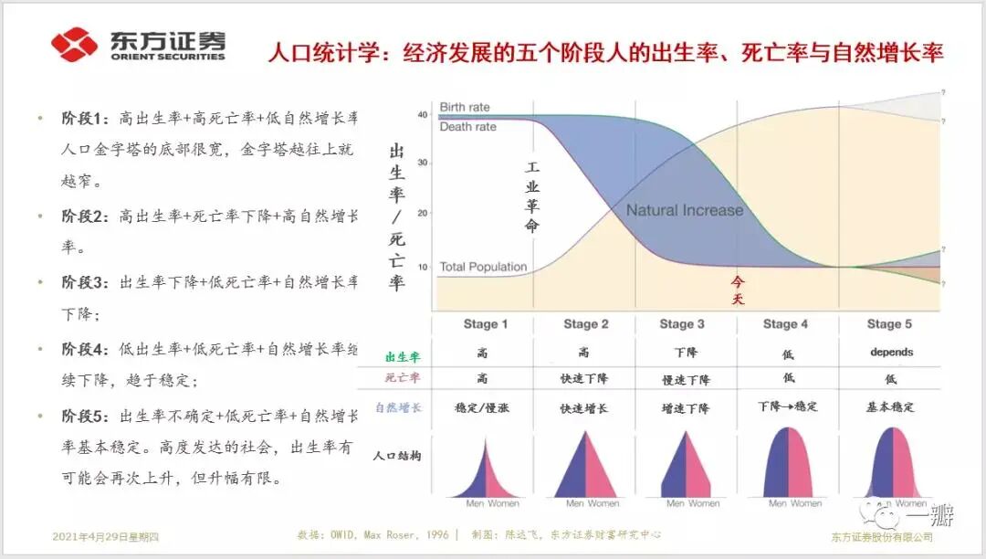 第1阶段,高出生率、高死亡率和低自然增长率,人口金字塔的底部很宽(表明人均寿命很低),侧边为曲线,向上加速越窄;第2阶段:出生率仍处高位,死亡率开始下降,自然增长率开始上升,人口结构逐渐转变为标准的金字塔;第3阶段:出生率开始下降,死亡率降速趋缓,自然增长率继续上升,但边际趋缓,金字塔重心上移;第4阶段,出生率延续下降趋势,死亡率位于低位,自然增长率继续下降并趋于稳定;第5阶段:出生率上升或下行均有可能,但幅度较小,死亡率处于低位,自然增长率低位波动。