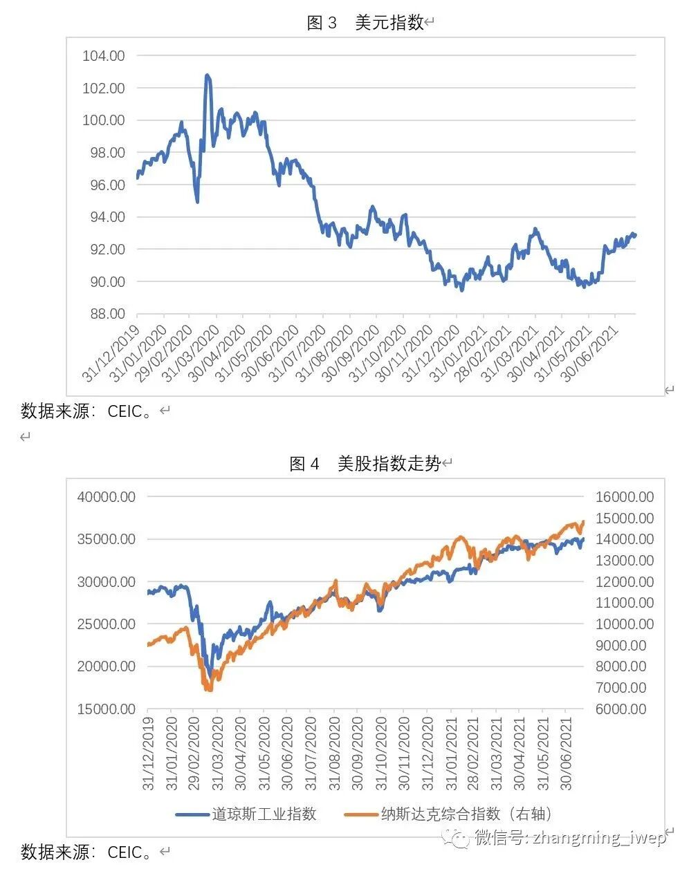 最近两个月以来,美元指数不降反升(图3)。长期美债利率下降与美元指数上升并存,意味着市场上的确存在着较强的避险情绪。但另一方面,如图4所示,目前无论道琼斯工业指数还是纳斯达克综合指数近期都迭创新高,这说明至少在美股市场上,投资者风险情绪还是相当强的。