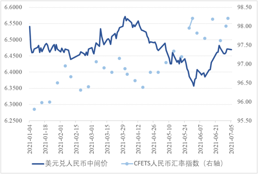 2021年第二季度,人民币兑美元汇率呈现出“V”型走势。2021年3月31日至6月30日,美元兑人民币由6.5713上升为6.4601,升值了1.69%;人民币兑CFETS篮子指数由96.88上升为98.00,升值了1.16%。2021年5月28日,美元兑人民币汇率中间价突破了6.40这一关口,达到6.3858,创下2018年6月以来的新高。