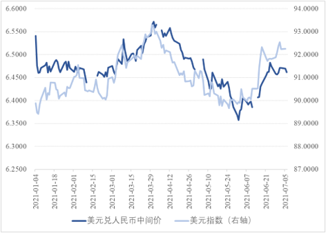 2021年第二季度,美元指数走势与人民币兑美元汇率变动呈现出非常强的相关性。美元指数的拐点出现在5月25日,美元指数降至89.6。这与人民币兑美元汇率变动拐点出现的时间基本一致。这表明,2021年二季度人民币兑美元汇率变动的主要驱动因素是美元指数的变动。张瑜(2021)认为尽管人民币汇率波动贬值的概率更高,但贬值压力并不大;这一轮人民币应对美元指数反弹的安全空间很充足,汇率贬值对市场情绪影响会弱于以往。