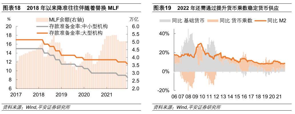 从基础货币缺口的角度来看,2015年以来伴随外汇占款规模的下降,我国货币创造对货币乘数提升的依赖明显提高。截至2021年11月,我国M2同比8.5%中,货币乘数的贡献达到7.3%。而降准就是作用于货币乘数的提升。2018-2021年,每年降准幅度分别是2.5%、1.5%、1.5%(中小型)、1%。2022年1月、8月-12月的MLF到期规模均超过了5000亿元,相关时点的MLF续作情况值得关注。2022年,如果央行不希望进一步扩大公开市场操作规模,考虑到碳减排支持工具的规模扩张(从而投放基础货币)需要一个过程,且随着贸易顺可能高位回落,外汇占款有回落压力,那么要保持大致平稳的M2增长,2022年存款准备金率仍有1-1.5个百分点的下调空间(图表19)。