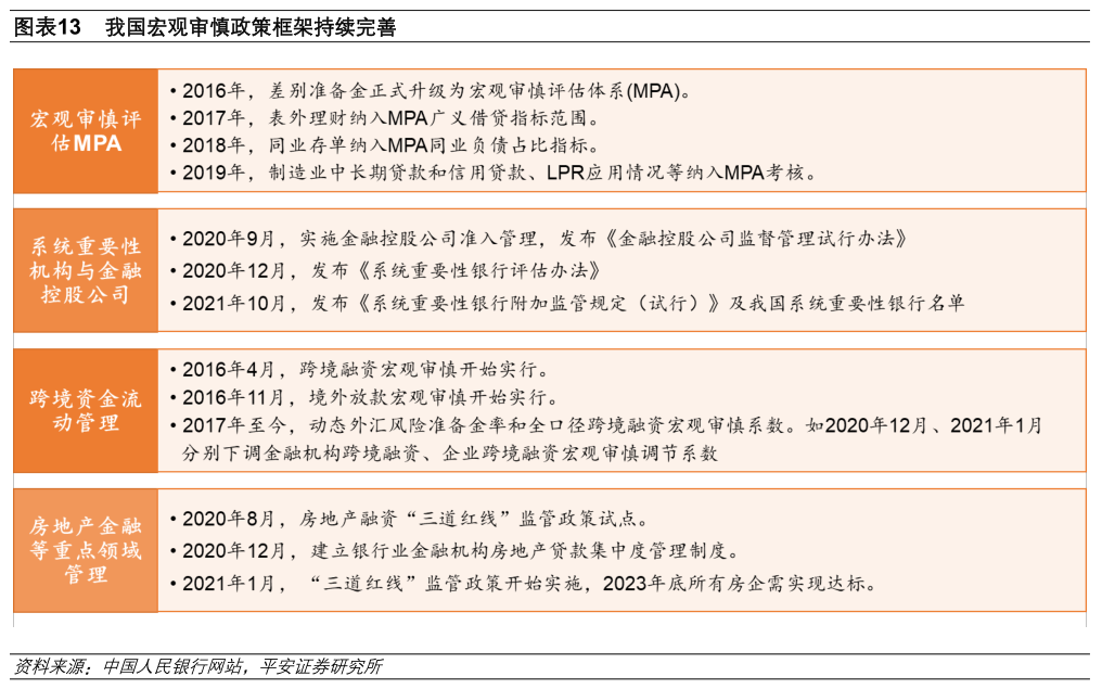 宏观审慎评估体系已成为引导金融机构信贷投向的重要政策工具。2017年,央行将表外理财纳入MPA的广义借贷指标范围;2018年,央行将同业存单纳入MPA同业负债占比指标;2019年,央行将制造业中长期贷款和信用贷款、LPR应用情况等纳入MPA考核。系统性重要金融机构监管对大型银行施加了更严格的监管约束。2020年12月,央行会同银保监会制定了《系统重要性银行评估办法》,明确我国系统重要性银行的评估方法。2021年10月,央行我国系统重要性银行名单及配套的《系统重要性银行附加监管规定(试行)》,从附加资本、杠杆率、大额风险暴露、公司治理、恢复和处置计划、信息披露和数据报送等方面对系统重要性银行提出监管要求。搭建起房地产金融管理体系引导资金流向。2020年8月推出房地产融资“三道红线”,2020年12月发布房地产贷款集中度管理规定,同时还以MPA考核体系中的贷款价值比(LTV)、贷款收入比(DTI)等工具,限制居民在房地产领域的风险敞口。在跨境资金流动管理上,2017年以来央行根据外汇市场和跨境资金流动形势,多次动态调整外汇风险准备金率、金融机构外汇存款准备金率、全口径跨境融资宏观审慎系数,释放政策信号和调节跨境资金流动。