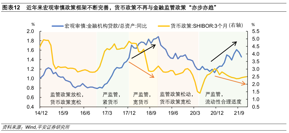 在宏观审慎框架完善之前,货币政策兼顾着防范局部及系统性金融风险的目标,因而时常需要适当收紧货币总闸门。而双支柱体系下,央行可以将金融稳定的目标适当“分流”给宏观审慎管理,使货币政策更专注于经济增长、物价稳定的总量目标。我们用金融机构贷款占总资产的比例衡量金融机构“脱虚向实”的边际变化,以这一比例的提升粗略表征金融监管政策趋严;3个月的SHIBOR则对货币政策的微调反应灵敏,可以体现货币政策的边际变化。以这两个指标作为代理变量可见,早期金融监管政策与货币政策的边际变化基本同步,而随着宏观审慎政策工具逐步完善,2018年上半年、2021年上半年都出现了监管政策趋严、货币政策宽松的背离情形(图表12)。