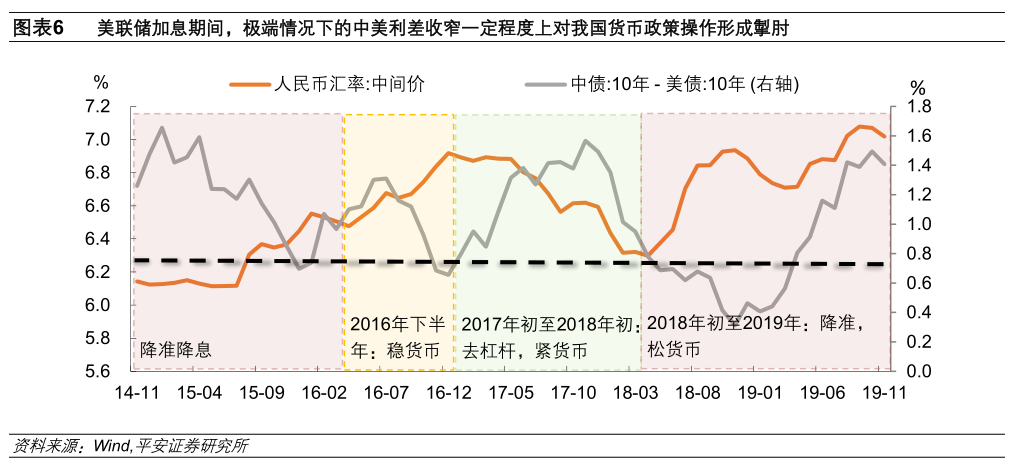 自2015年“8·11”汇改之后,人民币汇率与美元指数的联动性增强。在一些时点,中美利差收窄和人民币汇率贬值压力,一定程度上也对我国货币政策形成掣肘(图表6)。具体来看:1)2015年11月,国内降准降息后债市快速走牛,人民币汇率进一步贬值,中美利差一度收窄至80BP以下,而后央行未进一步“大水漫灌”。除回暖的经济基本面外,或亦担心中美货币政策分化加大人民币汇率贬值压力。2)2016年12月前后,中美利差再度收窄至80BP以下,央行初步表露出加强金融领域监管的态度,并于2017年1月加息。到2017年3月,美联储加息,中美利差再度触碰80BP左右分位,央行跟进了加息操作。3) 在中美贸易战的影响下,人民币汇率贬值压力较大,中美利差自2018年4月至2019年4月持续处于80BP的水准以下,尽管央行坚持了货币政策的宽松取向,但具体操作上却是以降准替换MLF为主,直至2019年8月利差回升至100bp以上,才祭出了降息操作。