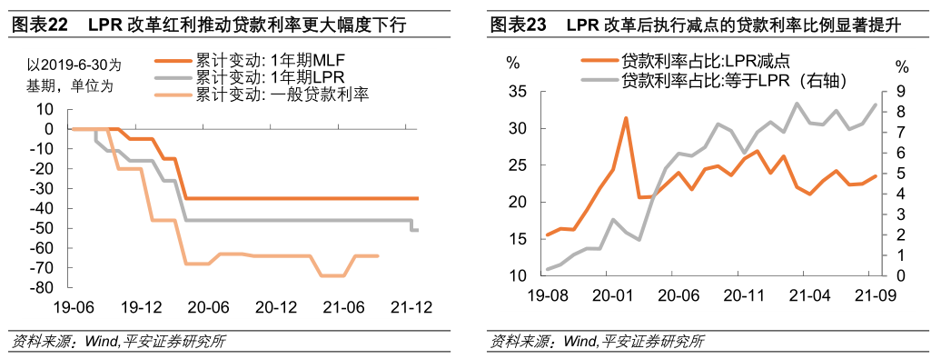 一是,推进存款利率市场化改革,进一步释放LPR改革红利,有望推动贷款利率进一步下行7-8bp(对应于贷款利率与LPR之间利差的收窄)。2019年LPR改革以来,一般贷款利率自2019年6月的5.94%下降至2021年12月的5.30%,累计降低了64bp,在此期间,一年期的LPR利率共调降了35bp,中间29bp的轧差主要来自于LPR改革的红利和银行净利差的压降(图表22)。目前,LPR改革在打破贷款利率0.9倍隐形下限、压降银行贷款点差方面已卓有成效(图表23),银行贷款利率中LPR减点、等于LPR利率的占比自2019年8月至2021年9月累计提升了16个百分点。不过,疫情后执行LPR减点的贷款占比先降后停,侧面体现出银行让利实体经济的压力较重,后续银行净息差的压降空间可能比较有限,未来改革的重点或是推进存款的利率市场化改革,通过降低银行负债成本推动贷款利率下行。央行2021年三季度货币政策执行报告提及,“持续释放 LPR 改革潜力,充分发挥 LPR 改革在优化资源配置中的作用……督促落实优化存款利率监管措施,保持银行负债成本基本稳定,继续推动金融系统向实体经济让利。”具体措施或从两方面入手:一方面,强化银行存款自律机制,打击高息揽储行为;另一方面,完善货币基金、现金理财等资管产品的管理制度,打破隐形刚兑预期,大力发展同业存单指数基金,以居民资产配置的优化为银行拓宽低成本资金来源。