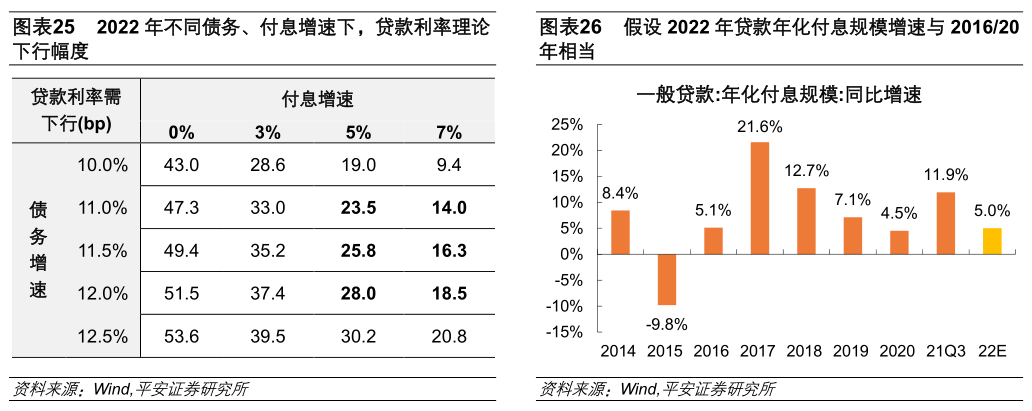 从减轻实体经济利息偿付压力的角度出发,上述前两类政策工具红利释放之后,实体经济付息规模的同比增速有望下降至7%左右,增速水平横向对比不算高;如经济下行压力较大,需以类似2016年的更大力度支持实体经济,则政策利率还需下调10~15bp。考虑到目前较宽松的货币政策基调与支持实体经济的诉求,假设2022年信贷规模以11%~12%的速度增长,将2021年12月20日1年期LPR调降的5bp纳入考虑后,我们测算(图表25、图表26):1) 如需将2022年实体经济付息增速控制在5%左右(与2016年、2020年相当,弱于2015年的刺激力度),贷款利率的中枢较当前水平还需进一步降低24~28bp。在扣除前两类政策工具降低贷款利率共约15bp后,还需调降政策利率10-15bp。2)如仅将实体经济付息增速控制在7%左右(与2019年相当),贷款利率的中枢较当前水平需降低14~19bp,依靠前两类政策工具即可基本满足。我们倾向于认为,第一种情形可能性更高,即货币政策需要“多措并举”支持实体经济(尤其是其中的薄弱环节),并避免我国宏观杠杆率再度过快攀升。