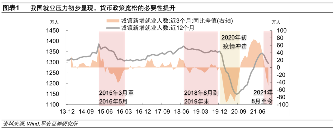二是,就业压力逐步显现,凸显出货币政策托底的必要性。从滚动12个月的城镇新增就业人数可以看到,2021年9月以来,我国新增就业人数已经出现显著下滑;到2021年11月,新增就业人数已经远低于疫情前的中枢水平(图表1)。回顾历史,与当前就业压力较为相似的是2015年至2016年、2018年下半年到2019年末、2020年上半年三个时间段,货币政策在这些时间都以宽松托底为主。