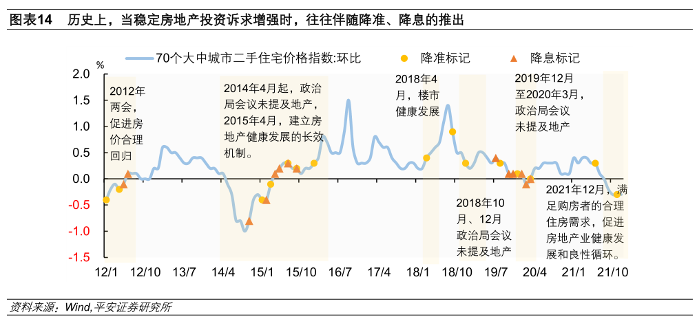 在上述宏观审慎组合拳下,货币宽松对地产、城投、资金空转等的外溢效应已减弱,从而可获得更大的调节空间。同时,在防范化解风险的过程中(比如目前仍在调整过程中的房地产),为缓解资产价格的剧烈波动,避免“因处置风险带来的风险”,在关键时点货币政策还有必要配合性地宽松,一如2019年“包商银行事件”之后、2020年“永煤事件”之后的宽货币。此外,2022年促进房地产行业“良性循环和健康发展”成为稳增长的核心内容,而历史上当稳定房地产投资诉求增强时,往往伴随降准、降息的推出。当前,在“房住不炒”的中长期基调下,配合房地产融资宏观审慎管理框架的形成,货币宽松的空间也已打开(图表14)。