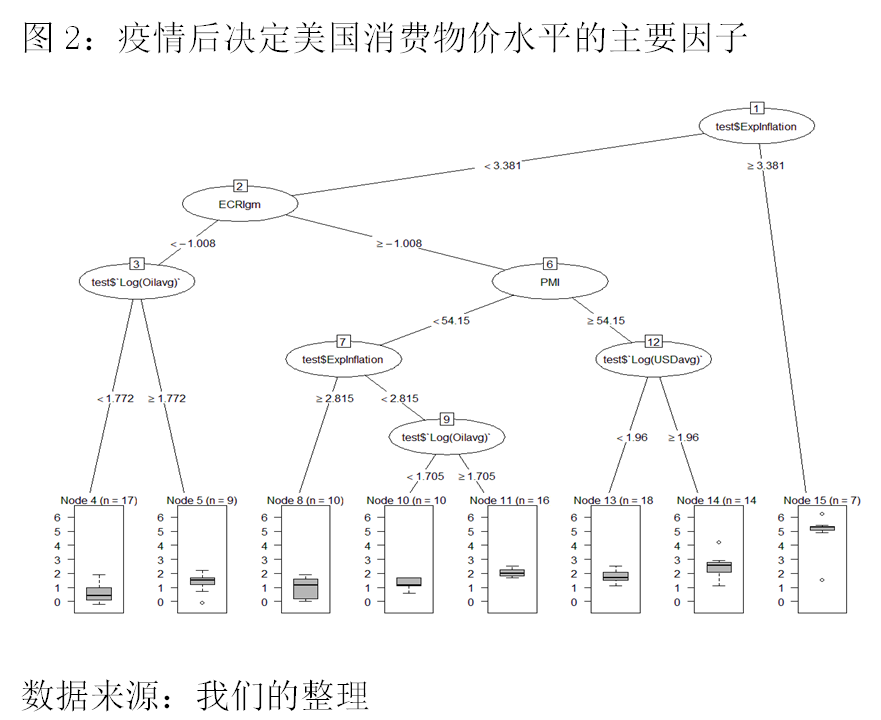 机器学习解析疫情前后高通胀成因。当前业界对美国高通胀成因分析普遍存在两个方面制约:一是在通胀成因分析的过程中往往假设通胀数据总体服从正态分布,然而通胀数据总体分布是否存在正态分布特性本身未知;二是研究通胀成因时样本容量有限, 运用中心极限定理实施参数检验,推断总体的集中趋势和离散程度的参数情况容易产生偏差。基于文献回顾,相比于传统的回归模型,机器学习模型可以在对总体分布不做假设的情况下,利用非参数的检验方法,直接从样本中分析推断出总体分布,从而能够提供一个更加有纪律性的非参数方法分析预测经济结果。同时,机器学习在总体分布未知或偏态情况下对小样本数据的分析往往更加稳定且精确。根据经济学家Kohlscheen等人(2021)的建议,我们构建了决策树模型,对影响美国CPI变化的因子进行交互分析,通过研究各个影响因子之间的联系,从而揭开各个影响因子与美国通胀水平之间的非线性关系。同时,通过分析疫情爆发前后影响美国CPI变化的主要因子的演化,进一步判断了这些影响因子是否将对美国高通胀存在持续性的威胁。我们围绕菲利普斯曲线模型、现代货币主义理论以及整体通胀水平等多个方面归纳了影响美国通胀水平的潜在因子:一是ECRI 领先指标(注[1]),反映了利率及市场流动性的变化对通胀水平的影响;二是原油价格,会影响整体通胀水平;三是PMI制造业采购经理人指数,反映了短期制造业在生产和价格端的表现;四是12个月的通胀预期,反映人们对未来通胀的预期判断;五是美元指数,反映了国际资本流动性对通胀水平的影响。数据样本时间从2013年6月至2021年10月,其中数据的训练集的时间段为2013年6月至2020年3月,而数据的测试集始于美国疫情第一轮爆发的时间点(2020年3月)直至美国疫情第四轮结束(2021年10月)。