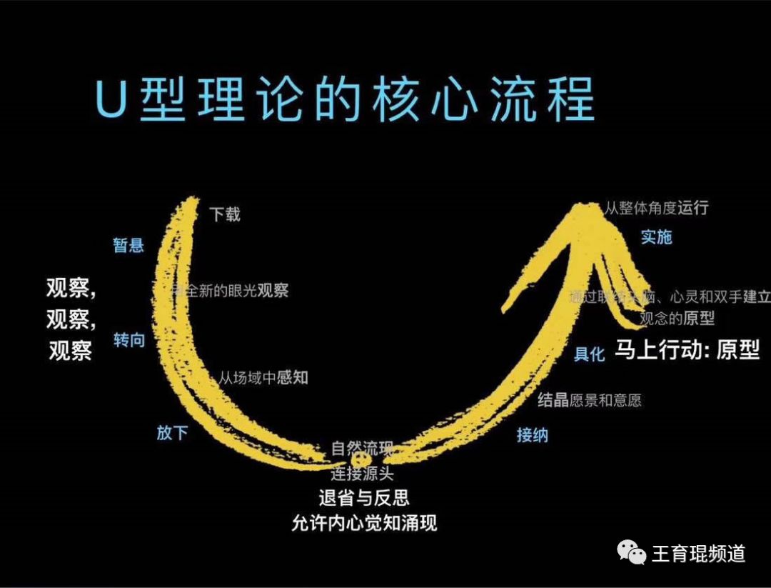 这个向正在发生的未来学习的模型,是在奥托·夏莫U型理论模型的基础上,结合贝佐斯、乔布斯、稻盛和夫、任正非四位经营之圣的学习方式,注入了新的内涵。