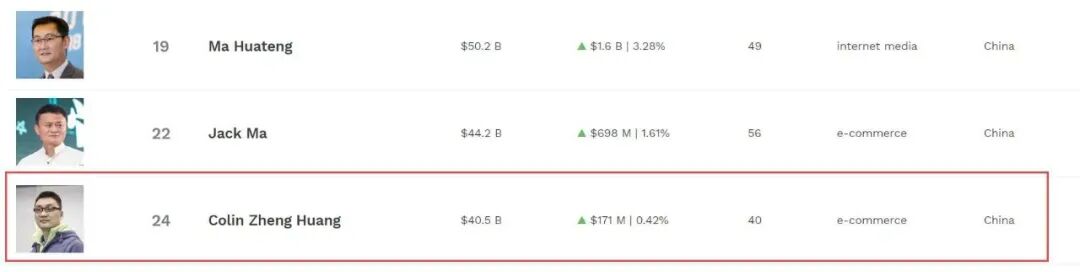以下是福布斯实时数据。按6月16日当日拼多多市值计算,黄峥身价超过430亿美元,比百度市值还高......