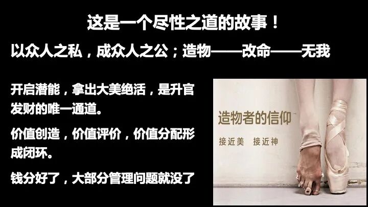 所以华为亿万富翁多了去,“以众人之私,成众人之功”。华为是大家的。这里边有一点味道,因为任正非这个人非常实际,他知道怎么去激发员工,你得尊重他的使命,你除了要让他实现自我价值,要实现他的自我超越,要“用物质力量巩固精神力量”,应该给他足够的钱,让他巩固他的精神力量。华为有天下至诚之人尽其心,你能尽人之性,这就是说一个造物者的心理的过程。