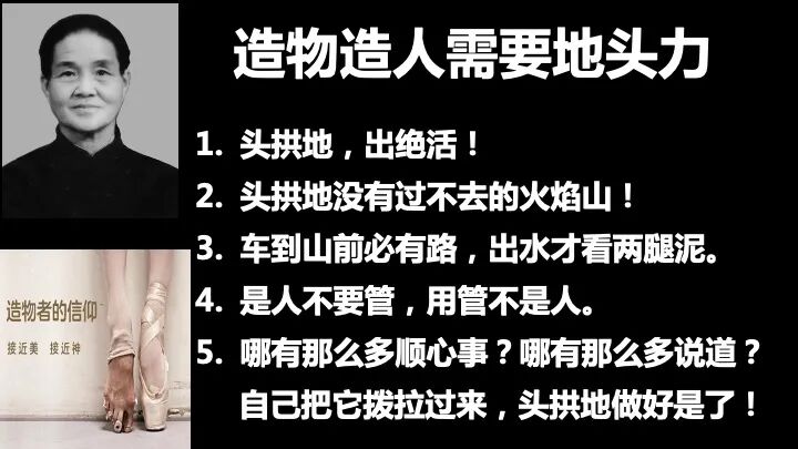 是人不用管,用管不是人。只有把自己天性的尊神请出来,让他自己去开启天赋潜能,才靠谱。所以孩子教育,要把权力给孩子。看,这个10后在不停的点头,这是爸爸妈妈多大的福气。他们都有这种开启自己天赋潜能的心性,他们当然想把自己还没有发现存在的天赋潜能拿出来,变成大美绝活造福人类。稻盛和夫的这个敬天爱人的故事,前排这几个10后的小孩听懂了,我太高兴了。这就是一颗经营之圣成就之路的种子,期待这颗种子,能在这个新旧交替的午夜,生根、开花、结果。看到这张芭蕾脚图,你能不能想象到唐三藏在唐朝安史之乱后,人心混乱的时刻,唐三藏一个人孤独的穿越戈壁去西天取经?看到这张芭蕾脚图,你是不是可以想象,无数的革命先烈,为了今天我们的幸福生活,而抛头颅洒热血,牺牲了自己的生命?特别是一些领袖,他们已经进入了很高的觉悟。