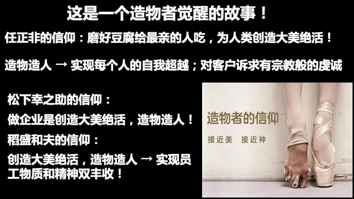 稻盛和夫的所有的案例,每一刻都要创造大美绝活,在造物造人中实现员工的物质和精神的两方面的幸福。这是很清晰的。所以今天要回到我们企业中来,所以我就想把这个原点给夯实了。