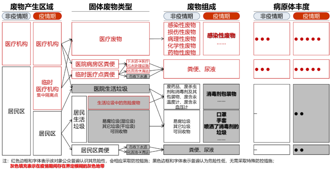 从废物产生区域来说,红框部分中的医疗机构、临时医疗机构等无论是在非疫情期还是疫情期,都是被重点关注的区域,其产生的废弃物是比较明确的医疗废物。黑框部分则是比较清晰的生活源废物。