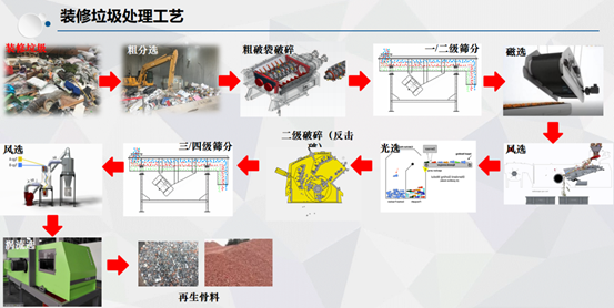 拆除垃圾的处理工艺,确定为“两级破碎+两级筛分+两级风选”。先经过一级筛分设备将大件杂质去掉,然后经过第一级粗破碎——鄂破,再用磁选,把铁类金属选出来,然后进行风选,把木材、塑料、橡胶等物质筛出来。之后进入二破——反击破,再通过涡电流分选,把非铁类金属选出来,接下来进行两级筛分及风选,分出再生骨料,可以结合后端利用途径,分成不同粒径集配的骨料。