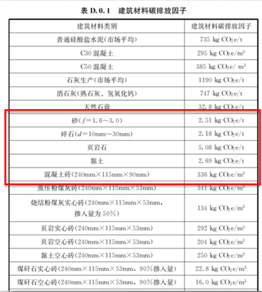 在“双碳”目标下,来看建筑垃圾处理。《建筑碳排放计算标准》(GB/T 52366-2019)6.2.5条中规定,建材生产时,当使用低价值废料作为原料时,可忽略其上游过程的碳过程。当使用其他再生原料时,应按其所替代的初生原料的碳排放的50%计算;建筑建造和拆除阶段产生的可再生建筑废料,可按其可替代的初生原料的碳排放的50%计算,并应从建筑碳排放中扣除。下表显示,砂、碎石等骨料的碳排放因子比混凝土砖的碳排放小了2个数量级。