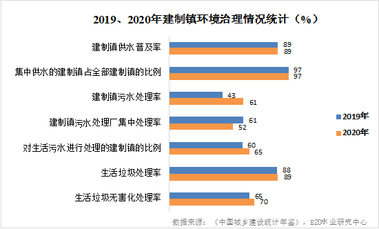近年来,国家“一号文件”持续关注我国农村发展的突出问题,其中的一个重要方向是农村环境的改善。“十三五”前期,由于规划、资金等一系列问题,村镇污水治理存在一定的延后,“十三五”末逐步发展,2020年建制镇污水处理率同比大幅提高,达到61%,比2019年提高了18个百分点。