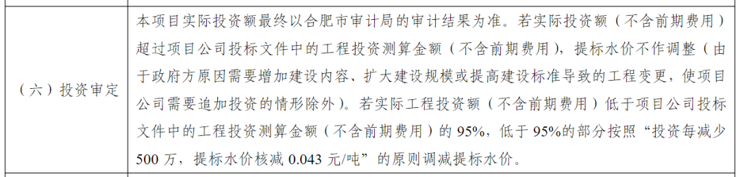《特许权协议之补充协议》第六条投资审定中规定,若实际工程投资额(不含前期费用)低于项目公司投标文件中的工程投资测算金额(不含前期费用)的95%,低于95%的部分按照“投资每减少500万,提标水价核减0.043元/吨”的原则调减提标水价。