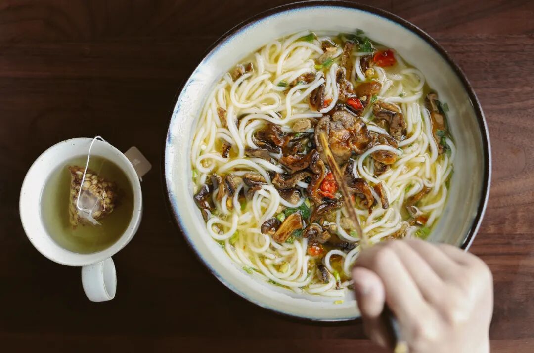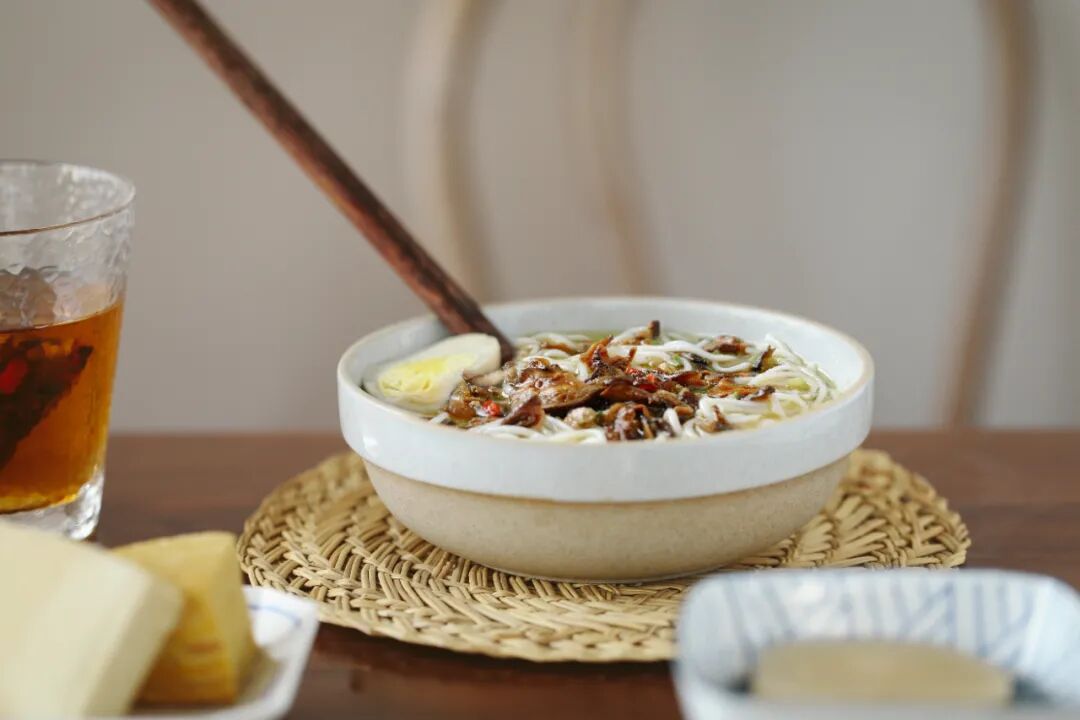 乳白色的米线,浸在香浓鲜郁的汤中,上面飘着大块菌菇。夹上一筷子,就着汤汁吸入。爽滑的米线顺着舌尖滑入口腔,携着汤汁的鲜香,冲击着舌尖的味蕾。
