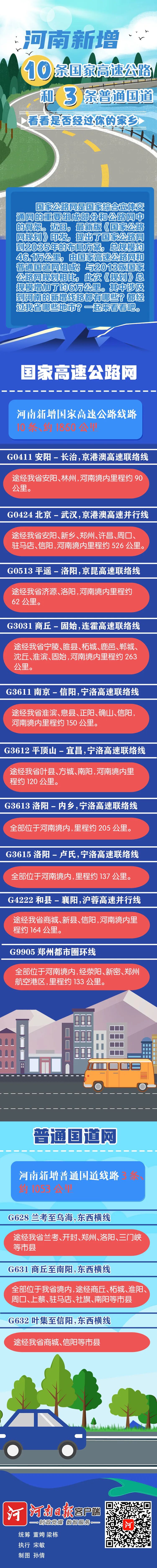 不要小瞧一座桥、一条路的力量。京杭大运河完成了中国经济中心南北转移,西伯利亚大铁路让寸草不生的远东成为地下宝库。新的规划路网将进一步加强对城市群和都市圈发展的支撑,国家高速公路网整体覆盖范围从城镇人口超过20万的中等及以上城市,进一步延伸到城区人口10万以上的市县,普通国道进一步补强了地市间通道和对重要景区的连接,为区域经济发展开拓新空间。京港澳高速联络线G0411安阳—长治,京昆高速联络线G0513平遥—洛阳,连霍高速联络线G3031商丘—固始,4条宁洛高速联络线G3611南京—信阳、G3612平顶山—宜昌、G3613洛阳—内乡、G3615洛阳—卢氏,京港澳高速并行线G0424北京—武汉、沪蓉高速并行线G4222和县—襄阳,郑州都市圈环线G9905。新增的3条普通国道均为东西横线,为G628兰考—乌海、G631商丘—南阳、G632叶集—信阳。