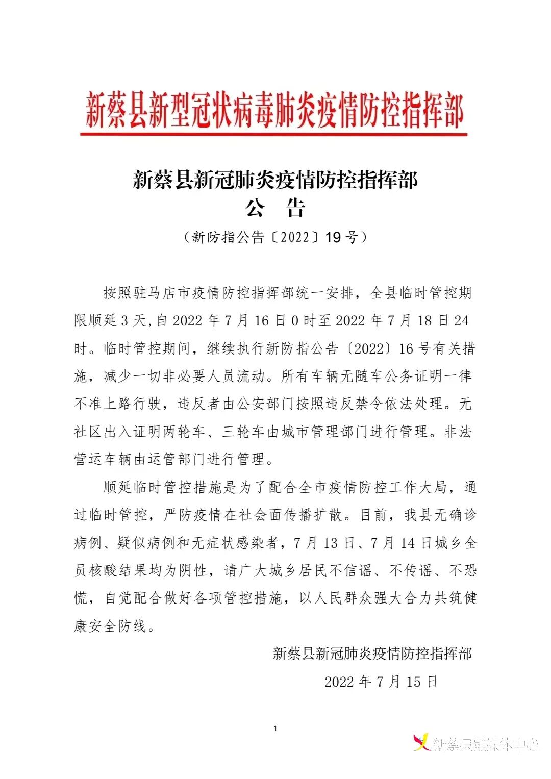 汝南县关于延长全域静态管控期限的通告