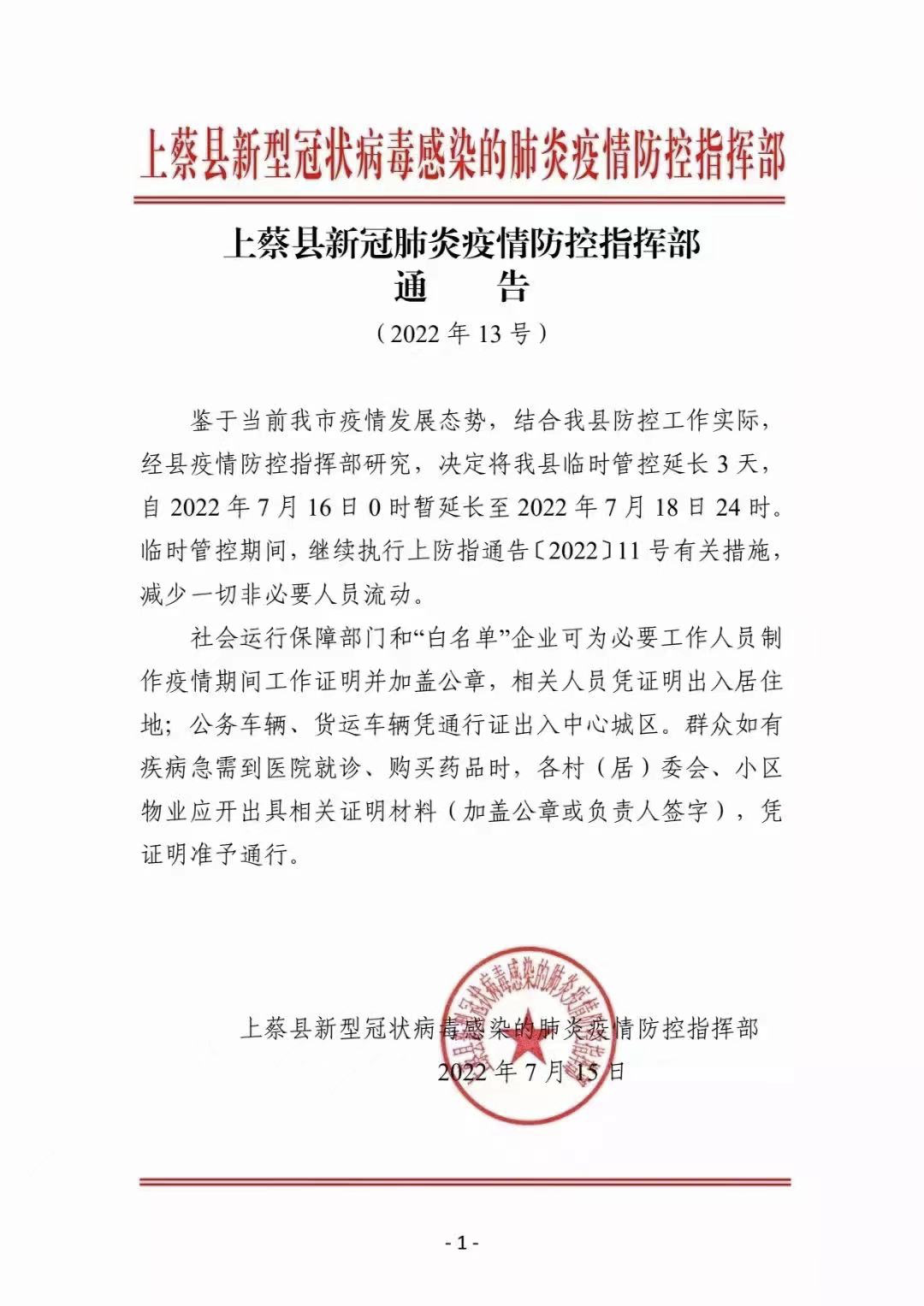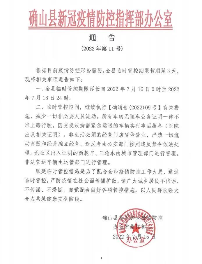 一、全县临时管控期限暂延长至2022年7月18日12:00时。