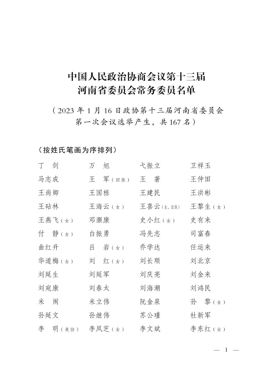 中国人民政治协商会议第十三届河南省委员会常务委员名单