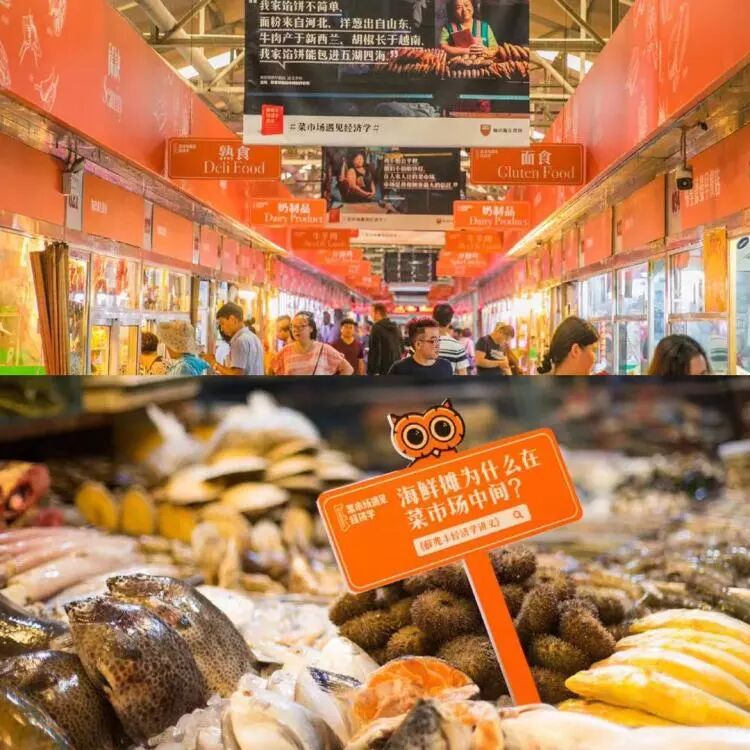 从移动支付、到涌现出的各类平台为传统菜场提供完整供应链、配送、流量等各种工具和服务。互联网包围下的传统菜市场正在接受一波风生水起的数字化洗礼。作为第一批被升级的三源里菜市场,互联网在这里产生的效应不只是革新了工具手段这么简单,得天独厚的先天条件,让三源里和其他菜市场相比,它的功能性可能不止是卖菜。毗邻使馆区,让市场吸引的流量来自世界各地;货品种类国际化,使得交易面向更宽阔的市场;30年的资历,让零售商户拥有黏性超强的客户群。这些得天独厚的条件被互联网渗透得更符合消费环境的同时,三源里菜市场也升级为一个曝光度极高的流量平台,这让其同类菜场望尘莫及,自然吸引了有了营销需求的企业或公司。换句话讲,并不是三源里菜市场卖的东西其他地方买不到,也不是这里卖的东西价格划算品质最高,而是因为这些东西摆放在三源里。▲“菜市场遇见经济学”主题艺术展前不久,就有一家燃气灶找上门求合作,被市场管理部的芬儿姐给pass了。这几天某维电视的人又不停给她发信息。还有想在菜市场做潮流文化的,说要搞个60人唱歌跳舞的快闪,芬儿姐明确告知对方:6个人都不行。“我知道大多品牌都是冲着‘三源里菜市场’这几个字来的,他们把这里当成打广告的平台,做点什么就有曝光度。”芬儿姐说。其实在三源里菜市场做过的跨界合作活动不多,2013年、2015年这里举办过关乎吃和生活的两次文创艺术展,18年知识付费平台“得到”在菜市场做了《薛兆丰经济学讲义》新书首发,开设了一场菜市场遇见经济学的主题展。被跨界的命运不只降临在三源里菜市场的头上,这两年“制造菜市场”营销正是一个流行的风口。2019年3月支付宝在菜市场搞了次文案主打的广告营销;地产品牌融创将书店开进了杭州翰林农贸市场,快闪活动现场还提供休息座椅和懒人沙发,可免费取阅图书;新锐智能手机品牌realme开了一家“很呛的店”,把手机和洋葱大蒜陈列在一起,试图将科技产品与菜市场结合,加深用户品牌认知。▲融创 x 杭州翰林农贸市场 快闪书店品牌方都盯上了菜市场这块宝地,一是这个人情味、烟火气十足的场景更易于制造反差营销的效果,再一个其独特性能让消费者形成强烈的记忆。更特别的是,随着传统菜市场逐渐消失和生活互联网化,更让这里成为一种情感寄托,“寻找生活的气息就去菜市场”成为现代城市人治愈人生的信条。我问芬儿姐,三源里菜市场这么红,作为管理人员对合作的活动把控是不是很严?她说绝大部分是,“毕竟菜市场就该有菜市场的样子。”还有一部分来自菜市场的倔强,芬儿姐告诉我,很多合作方提的方案让她搞不懂这些品牌营销为何非要挤到菜市场。“三源里还是更倾向公益、生活化的活动,太高端的东西不合适。还是那句话,这里就是卖菜的地方。”“那菜市场这次怎么和宝马这样的豪华车品牌合作了?”我不禁好奇。“唉,主要还是因为腾讯新闻找过来。”她停了几秒接着说,“我个人是觉得之前那次艺术展挺好,和我们菜市场挺搭,也确实吸引来不少人。”▲菜市场摊位一角