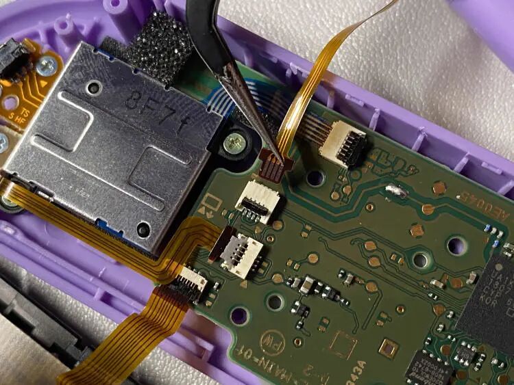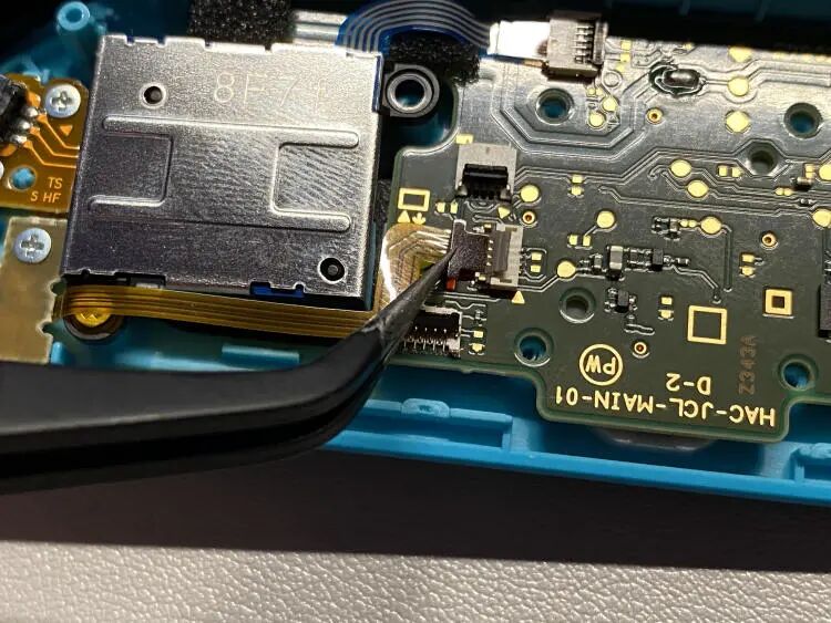 用镊子向上拨开 ZL、SL 以及 SR 扳机的排线扣具,继续用镊子轻轻向外抽出排线。(我的适马三剑客对此处微距已经无能为力,抽出手机接着拍)