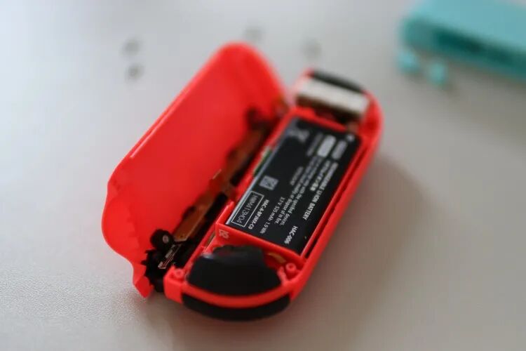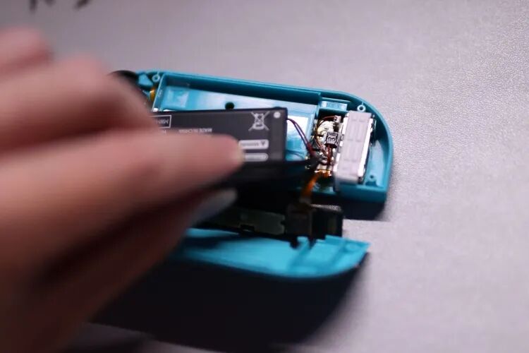 从电池底部轻轻撬下电池——千万别用镊子把电池戳破、或者把电池掰到形变,千万别用镊子把电池戳破、或者把电池掰到形变,千万别用镊子把电池戳破、或者把电池掰到形变——避免你的 NS 变 Note 7 的事情说三遍。再向外轻扯一下电池排线、向上提起、卸下排线,给手柄断电。